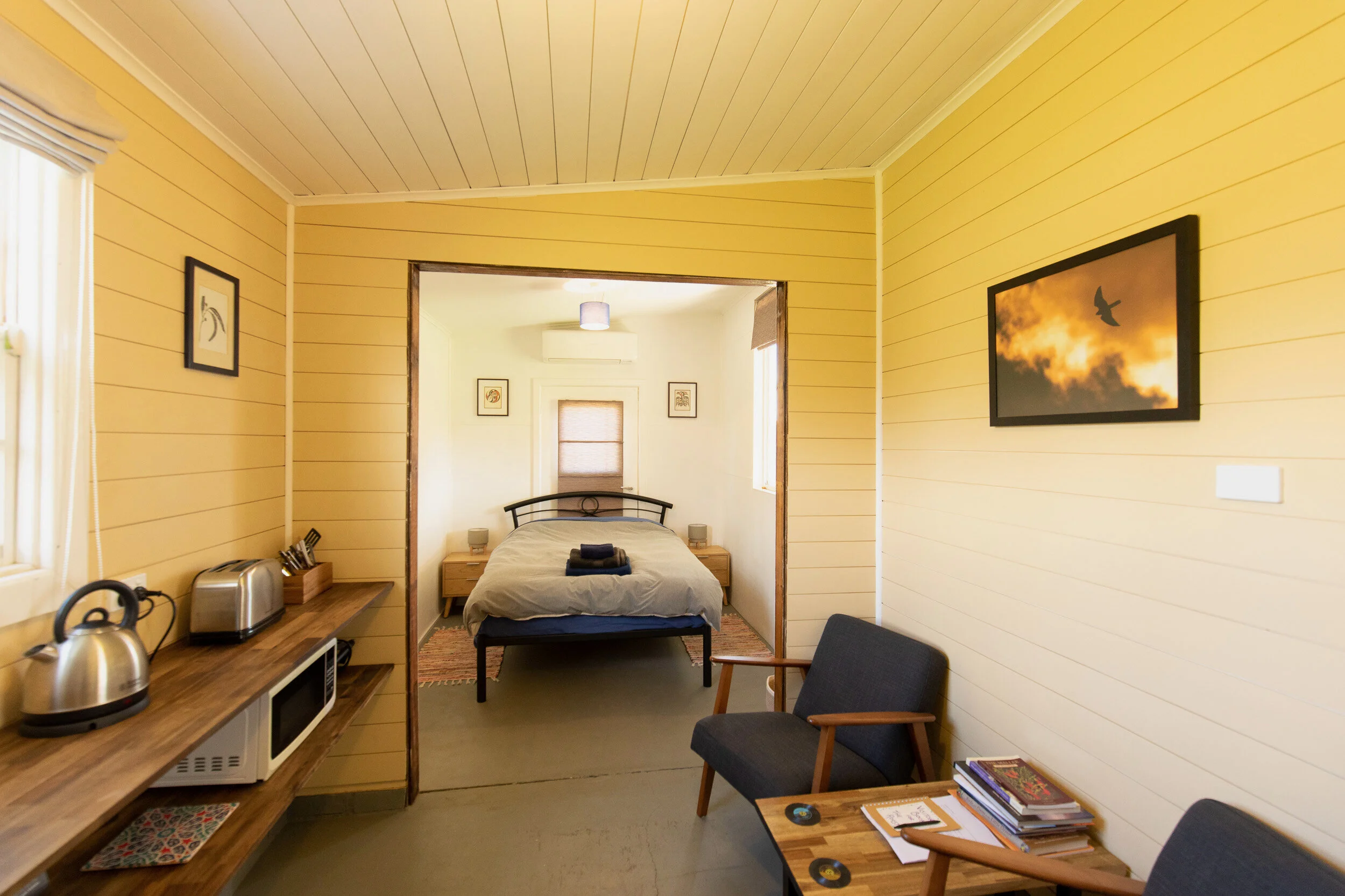 With a double bed at one end (or two singles with prior arrangement and $50 surcharge) and a kitchenette with lounge at the other, you’ll have everything you need to relax and enjoy the peaceful surroundings after a morning of birding the Mallee or wandering through the native bushland.